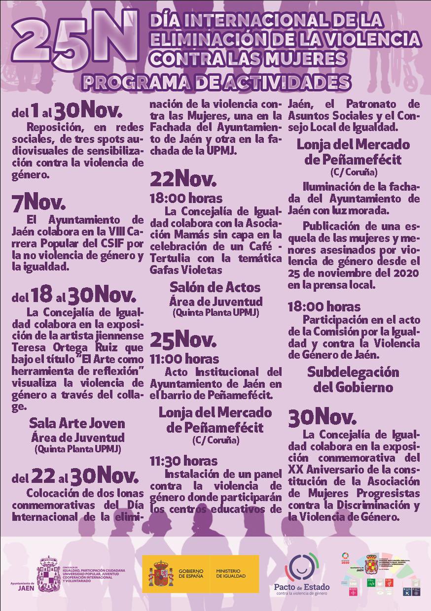 El día 25, la Diputación celebrará un acto institucional en la lonja del Palacio Provincial durante el que ha detallado la diputada de Igualdad, Rocío Zamora, "se leerá un manifiesto consensuado con las ocho administraciones provinciales de Andalucía y se hará un homenaje en memoria de las víctimas de violencia machista, con una actividad de sensibilización en la que se quiere concienciar a la sociedad de nuestra provincia sobre el problema de la violencia contra la mujer". El desarrollo de este evento será grabado para que se pueda ver en el perfil de Youtube de la Diputación de Jaén.