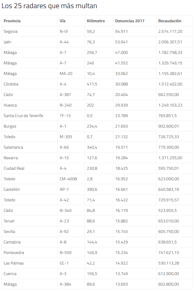 Ya sabemos dónde se sitúan los 25 radares que más multan de España, en el podio se encuentra el radar de Jaén situado en la A-44, kilómetro 76,3, con 63.641 denuncias durante el año 2017.
