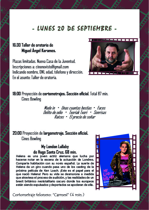 Todas las actividades, incluidas las proyecciones, son de entrada libre hasta completar aforo. Para los talleres será necesaria inscripción previa a través del correo electrónico cinenovisto@gmail.com. En el caso de las proyecciones, las entradas deberán recogerse en las taquillas de Cines Bowling.