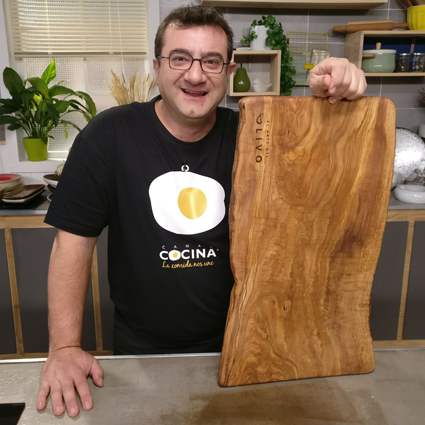 Sin duda la gente nos reconoce sobre todo por las tablas de corte. El modelo más solicitado es el modelo Cárabo, una tabla de borde irregular con la corteza natural del Olivo. Juan el artesano sin duda hace maravillas con ellas