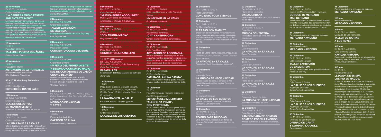 El centro peatonal de Jaén trae consigo casi 50 actividades para esta Navidad. Los jiennenses podremos disfrutar de conciertos en la calle, pasacalles, exposiciones, teatros, espectáculos de pirotecnia... ¡¡Y mucha diversión!!
