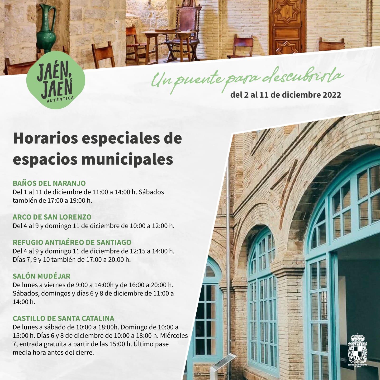 - Salón mudéjar: de lunes a viernes de 9:00h a 14:00h y de 16:00h a 20:00h. Sábados, domingos y días 6 y 8 de diciembre de 11:00h a 14:00h.