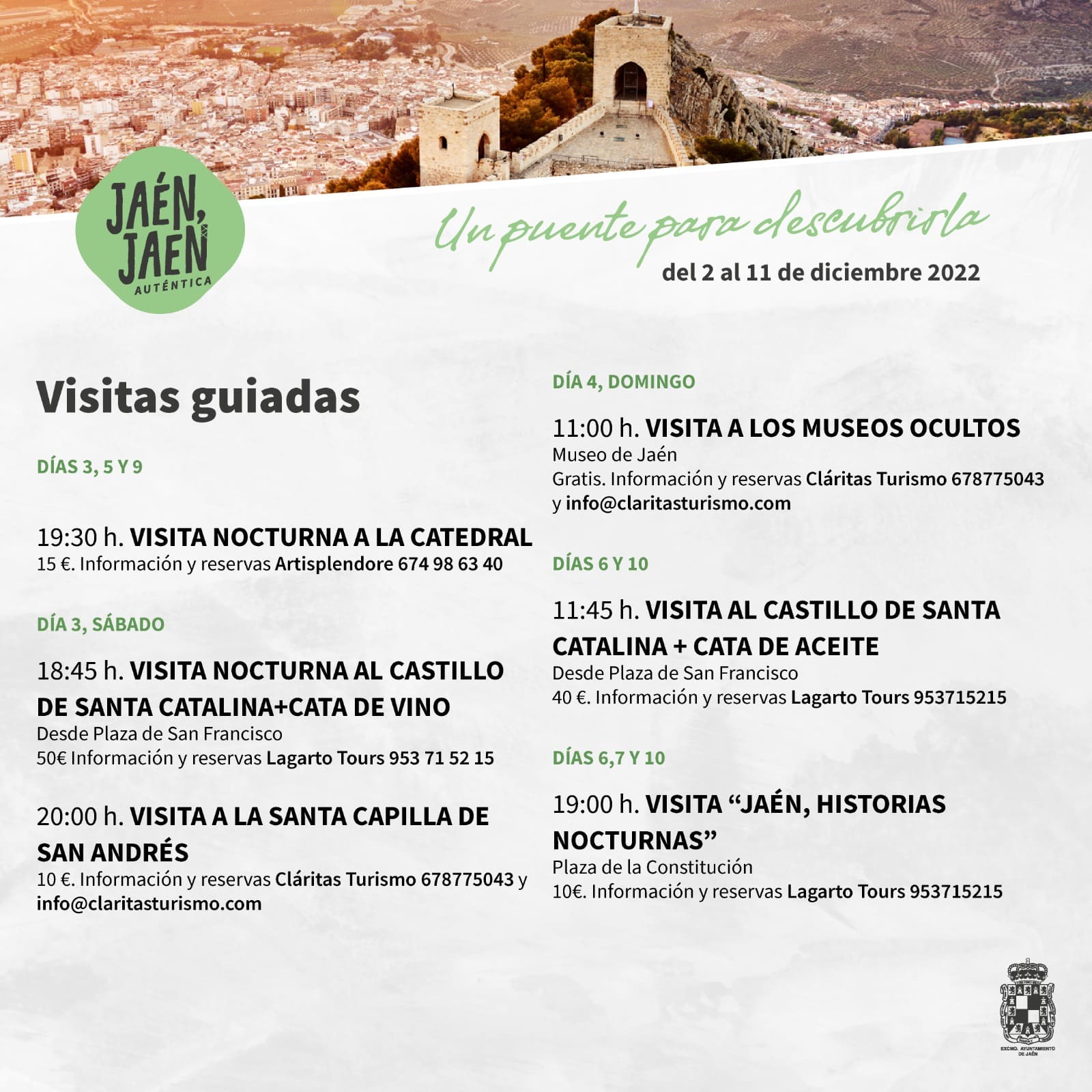 - Refugio Antiaéreo de Santiago: del 4 al 9 y domingo 11 de diciembre de 12:15h a 14:00h. Días 7, 9 y 10 también de 17:00h a 20:00h