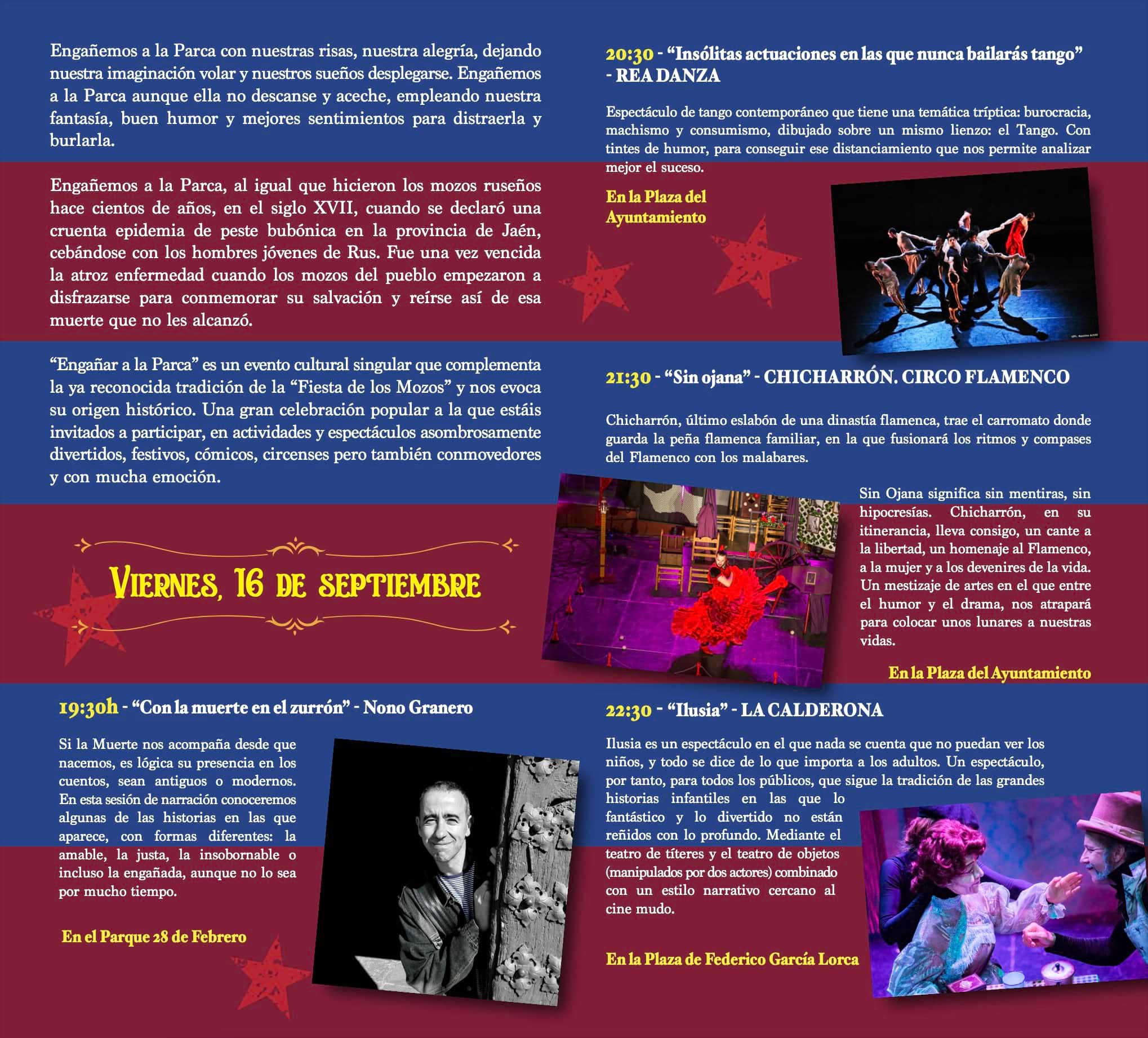 Este año dentro de su programación podremos disfrutar de teatros, espectáculos de baile, narraciones y conciertos, como el de los Mojinos Escocíos, así como de la tradicional procesión del Santísimo el domingo 18 de septiembre.