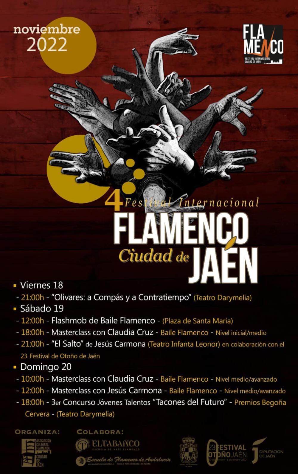 Se acerca la cuarta edición del Festival Internacional de Flamenco ´Ciudad de Jaén´. La cita, que se celebrará del 16 al 20 de noviembre, atraerá al público amante del flamenco a la capital jiennense para disfrutar con actuaciones como las de Jesús Carmona, Premio Nacional de Danza. A esto hay que sumar masterclass, flashmob de baile flamenco, el homenaje a Pepe y Fausto Olivares y la tercera edición del concurso jóvenes talentos ´Tacones del Futuro´.