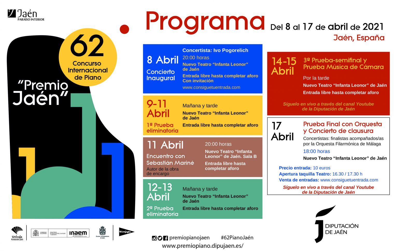 El concurso Premio Jaén Piano se retoma de nuevo este 2021 tras el parón del año pasado debido a la crisis del coronavirus. En esta edición el concurso cuenta con el récord de pianistas inscritos, con un total de 89 de 28 países distintos y como novedad podremos disfrutar de la semifinal y final del mismo de forma online a través del canal de Youtube de la Diputación de Jaén.
