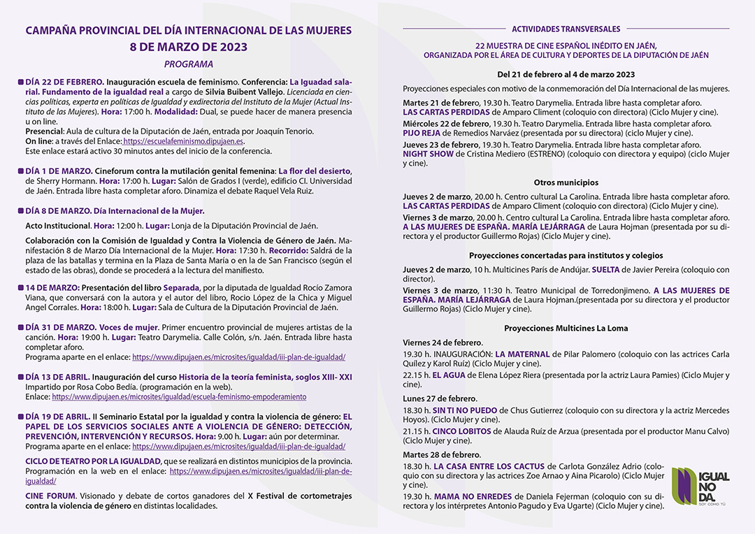 Entre las actividades programadas, hay conferencias y charlas a cargo de expertas en igualdad de género y feminismo, talleres, proyecciones de documentales y películas que abordan la temática de la mujer y la igualdad de género.